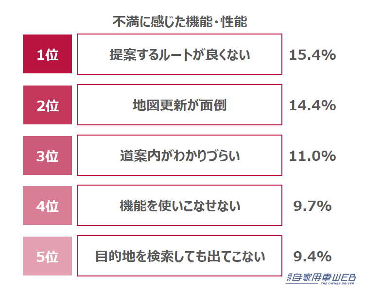 ルート案内など、カーナビ本来の機能・性能に不満を感じているユーザーが多い結果に。