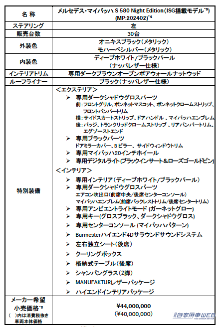 メルセデス・ベンツ日本は、 メルセデス・マイバッハブランドの特別仕様車「メルセデス・マイバッハ S 580 Night Edition(ISG 搭載モデル)」を発表。全国のメルセデス・ベンツ正規販売店ネットワークを通じて予約注文の受付(日本限定30台)を開始した。納車は2024年7月以降を予定している。