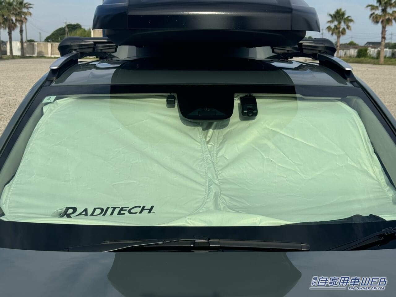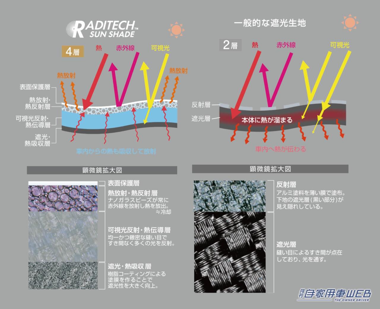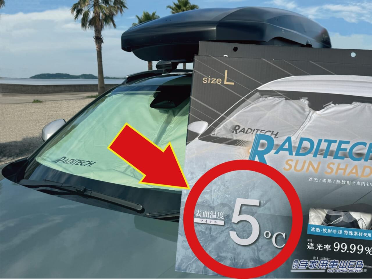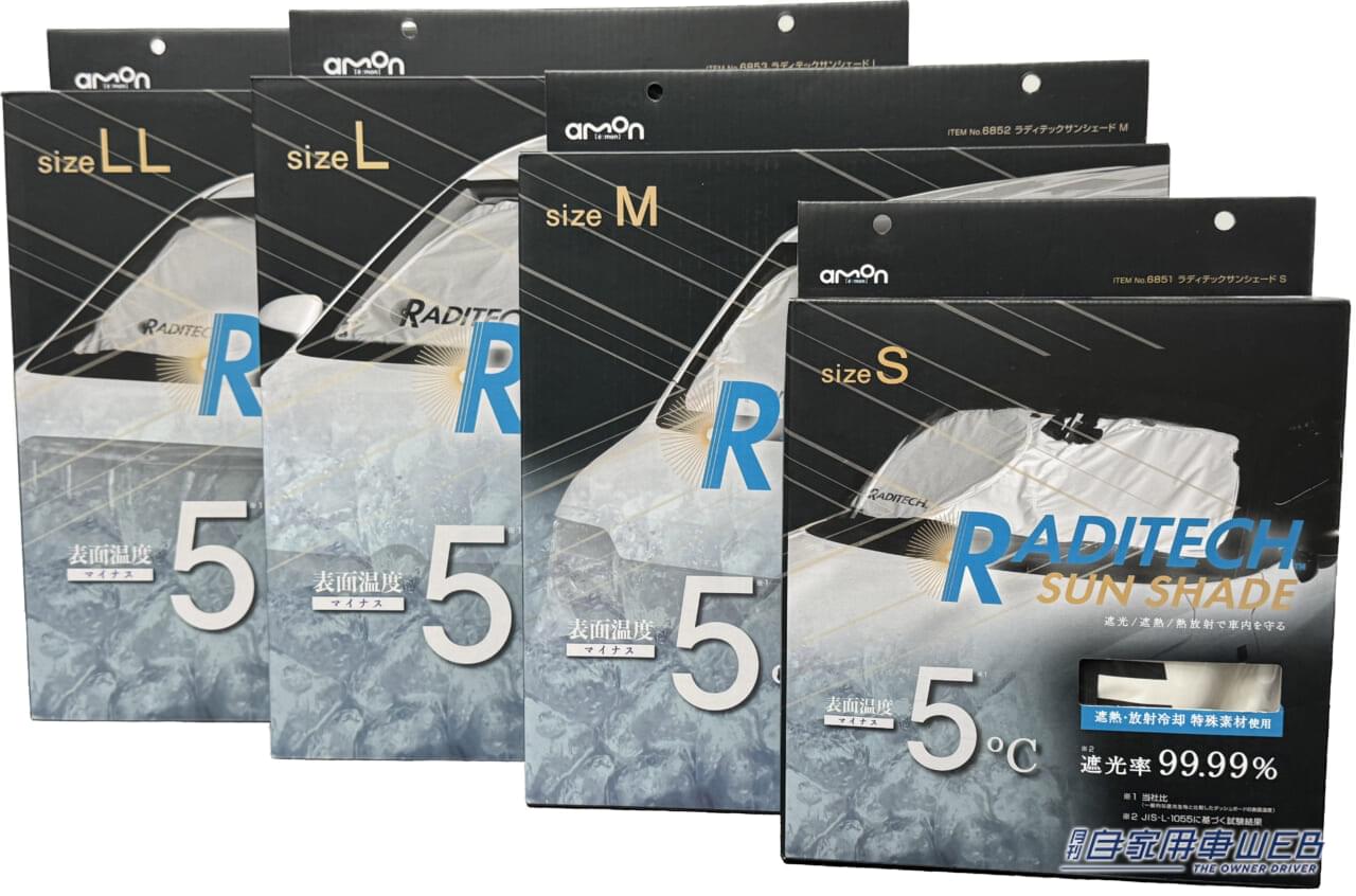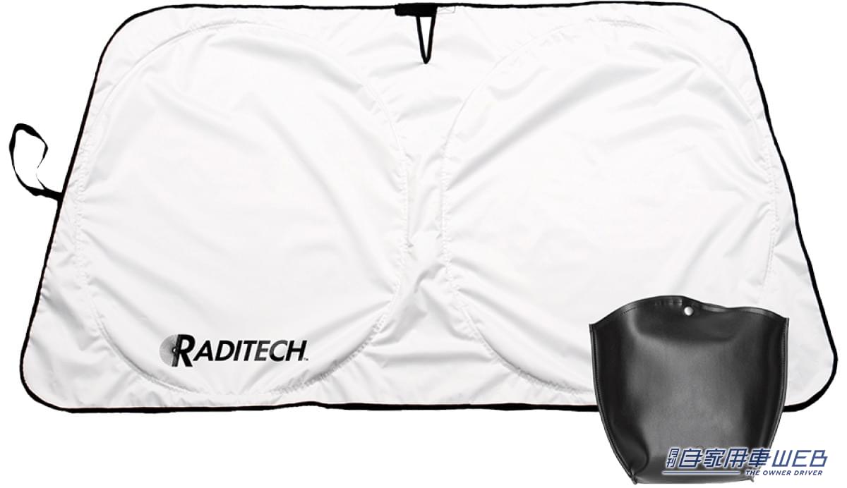 エーモンから発売された「ラディテック サンシェード」は、遮光率99.99%! 車内温度は一般的なサンシェードと比べると、なんと-5℃(ダッシュボード表面温度比)を実現している。これは、一般的なサンシェードが2層構造であるのに対して、ラディテックは4層構造となっているためだ。これにより、ほぼ光を通すことのない遮光性能を実現、そして表面には特殊素材であるナノガラスビーズを採用することで、赤外線を反射するとともに熱を放出して冷却性能を得ているわけだ。さらに室内側にも熱吸収層を設けることで、車内からの熱も吸収して放熱するというスグレもの。炎天下で駐車していたクルマに乗り込む際、少しでも車内の熱さが緩和されていると嬉しいよね。