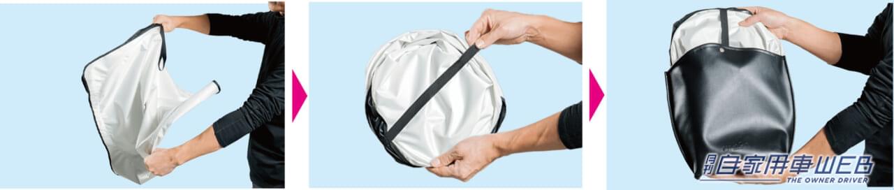 ポップアップ式の採用で簡単に広げることができるので、設置もカンタン。フロントガラスに沿って広げてバイザーで挟み込むだけでOK。ミラー部分に固定するマジックテープも装備されているので、ずり落ちる心配もない。もちろん、収納もカンタン。2つ折りにして、八の字に曲げるようにひねって折りたたみ、最後はゴムバンドで固定するだけ。付属の収納バッグに入れればコンパクトに保管できるので車内に常備しておくと便利。