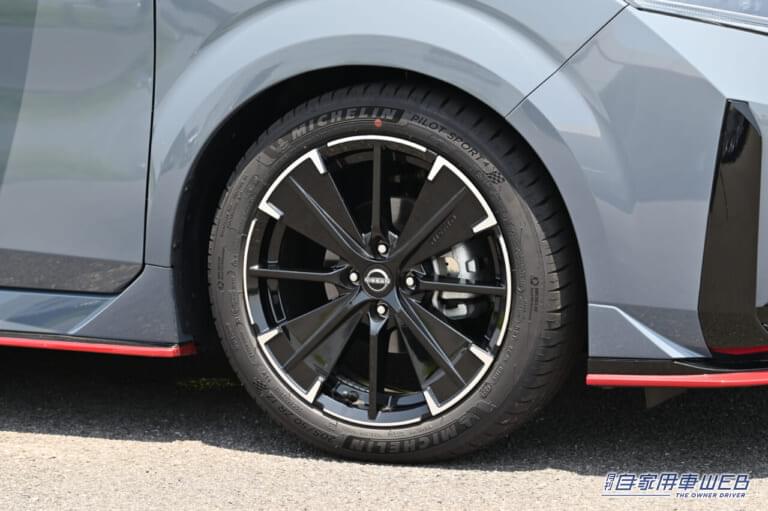 NISMO tuned e-POWER 4WDには、専用デザインのアルミホイールが装着される。このアルミホイールは、ホイールハウスの内圧を低減するデザインにより、走行中にダウンフォースを発生させるなど、走行性能と空力性能の両方に貢献する。
