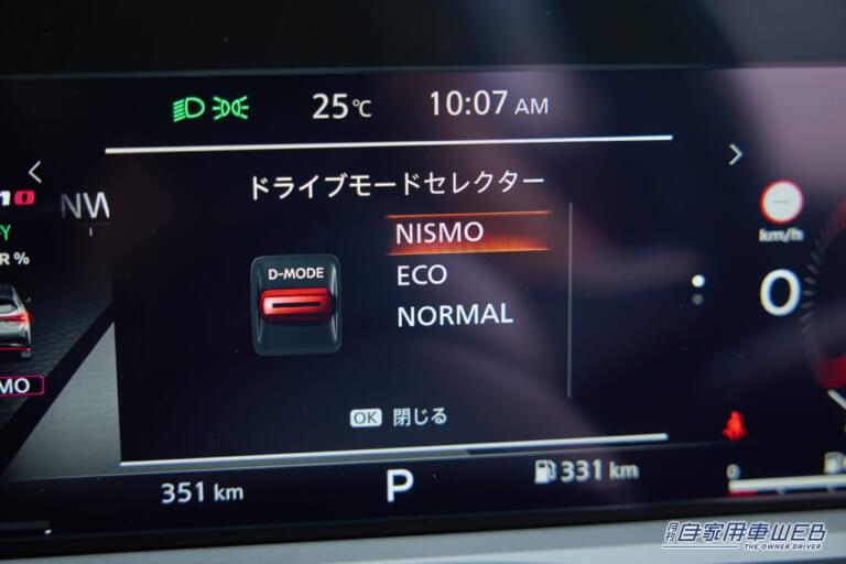 最もスポーティな特性となるニスモモードを選択しても速さを誇張するための殊更な演出はなく、あくまでもドライバーのコントロールに従順なのは、他のニッサン電動車系と共通だ。ただし、急激なアクセルオンにも正確に対応。一気に大きな加速力が立ち上がり、蹴り出されるようにダッシュ。刺激的な加速は電動4WDの高性能車ならではだ。