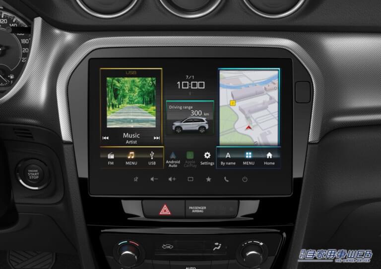 ビターラに採用されたカーナビゲーションは、ダッシュボードの形状に合わせたフレームデザインの9インチ高精細HDディスプレイ搭載モデルで、欧州48カ国の地図と17種類の言語に対応する。見やすい地図と分かりやすい案内表示で目的地までの最適なルートを案内するほか、スマートフォンと連携させる「Apple CarPlay」「Android AutoTM」をはじめ、多様なメディア再生に対応。「ナビゲーション」「車両情報」「オーディオ」に分かれたエリア表示でカスタマイズも可能なホーム画面により多彩な機能を簡単に操作できるほか、スズキコネクトのサービスと連携することで、ナビ画面上に各種通知が表示可能だ。
