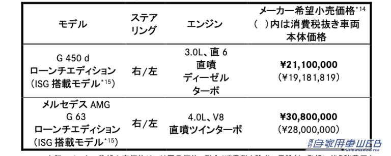 国内仕様車は「G450 d ローンチエディション」と「AMG G63 ローンチエディション」の2つの導入仕様車からデリバリーが開始される。