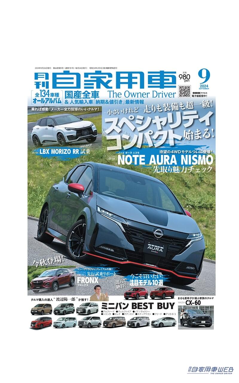 月刊自家用車9月号が7月26日に発売!待望の新型フロンクス、新型オーラNISMOの試乗記や今こそ買いたい注目の10モデル特集などを掲載!そのほか、新車の見逃せない情報が盛りだくさん。全国新車値引き生情報も!