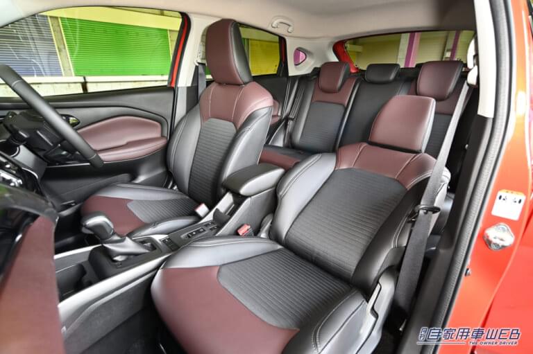 撮影車は革&ファブリックのコンビシートを装着。ショルダー部はボルドー色を用いることでプレミアムな雰囲気を高めている。シート形状は身体を支えてくれるサイドサポート&フィット感を意識したタイプ。この選択からも、走りを相当意識していることをうかがうことができる。