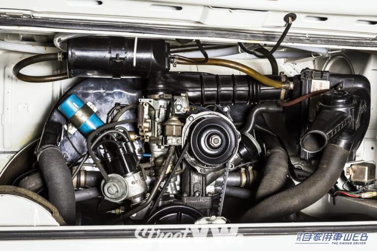 空冷VWのエンジンはコンパクトにまとめられている。中央にキャブレターを備え、そこへガゾリンを送るポンプとホースのつなぎ目が多数ある。そして、そのすぐ左に点火を司るディストリビューターやコイルが配置され、右には発電機が備わる。