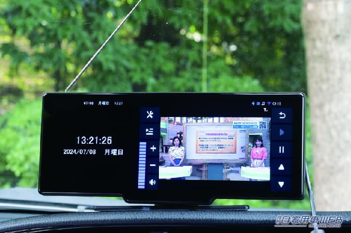 音声は背面のスピーカーから再生するが、内蔵のFMトランスミッターを使用すればカーオーディオのFMラジオを利用して車両のスピーカーから音声が聞ける。また、ワンセグチューナーを内蔵しているため、テレビ映像を楽しむことも可能だ。背面部分には受信用のロッドアンテナを備えている。