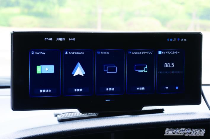 マルエヌが展開する新ブランド「NPLACE」からリリースされたばかりのモデル。実勢価格で3万円を切るロープライスも魅力だ。ディスプレイオーディオはインパネの純正カーオーディオスペースに装着するインダッシュタイプがほとんどだが、これはダッシュボードの上に装着するオンダッシュタイプとなっており、インパネの上に比較的平らなスペースがあればクルマを選ばず装着OK。電源はシガーライタープラグから取得できるためユーザー自身での設置が可能だ。