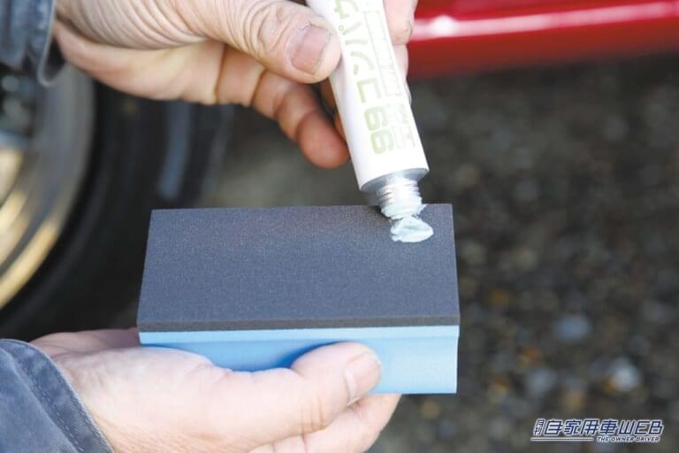 コンパウンド専用スポンジに細目のコンパウンドを小指の先くらいの量を絞り出す。