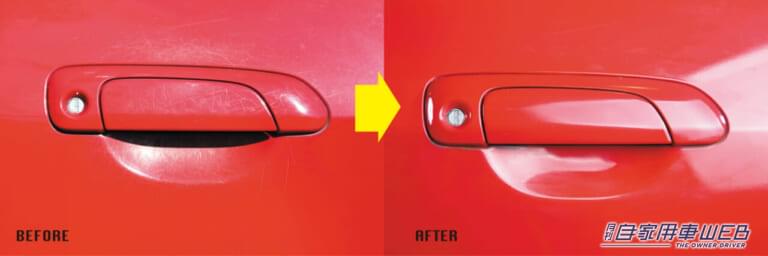 乗車時に必然的に手をかけるドアノブ周辺は爪先が触れやすく、それが原因で無数のスジ状キズに覆われやすい。このようなドアノブ周辺のスジ状の細かなキズもコンパウンドで簡単に磨き落とすことができる。キズは浅いため最初から極細でOKだが、スポンジが入らないため指先にウエスを巻いてコンパウンドをつけ、指を押し込むように磨くといい感じだ。