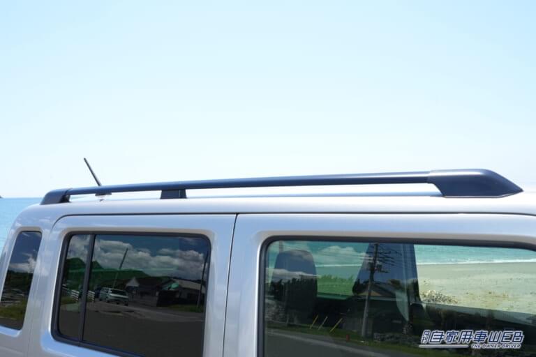 専用のフロントグリルやメッキバンパーガーニッシュをまとったフロントマスクからして、大自然の中に飛び込んでもビクともしなさそうな頼もしさに溢れている。ほかにも鮮やかなブラックルーフにはルーフレールを装着。15インチのブラックメタリックアルミホイールがガッシリと地面に踏ん張る佇まいも新鮮に映る。