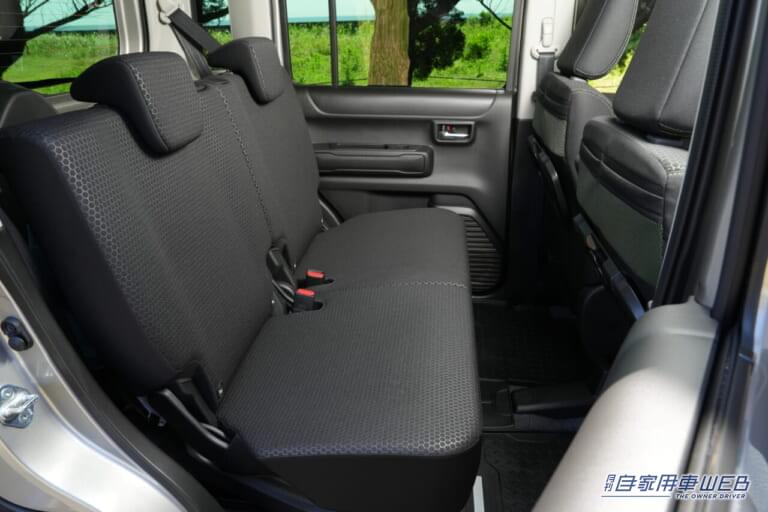 ラゲッジのフロア素材は樹脂製パーツを使用。汚れ物に強く、重い荷物を積んだり少しくらいラフに使っても傷がつきにくいメリットを持つ。後席のスライド操作も荷室側から操作でき、5:5分割で前に倒せば簡単にフラットなスペースが拡大。軽クラスとは思えぬほどの積載性と便利さを併せ持っている。