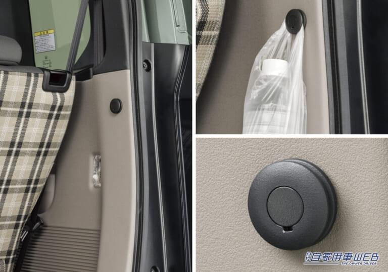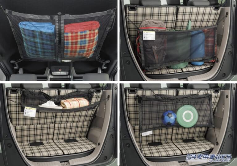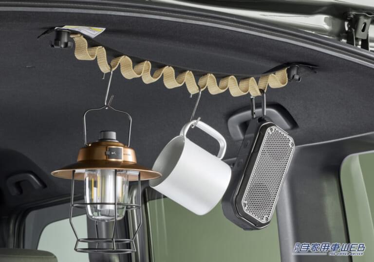 インテリアでは、ちょっとした小物をかけられる「ルーフユーティリティーフック」「ユーティリティーフック」、4つの使いかたで小物を多様に収納できる「ユーティリティーネット」などを用意し、レジャーシーンにおける利便性が高められるアイテムがラインナップされる。