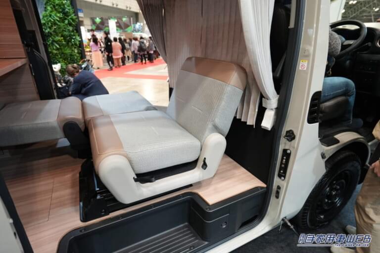 アレンジ方法はシート自体が回転するのではなく、シートの座面と背もたれを倒すことで、前向き、後ろ向きを設定できる独自の構造を持つ。さらにシート表裏で硬さが異なるクッションパッド構造を採用したことで、乗車移動時には程よい硬さで乗り心地を追求し、駐車時に後部座席側に反転させて使用する際には、柔らかなソファーのような座り心地を提供してくれる。バックドアを開ければ、車内で自然の景色を楽しみながらくつろぐことも可能だ。