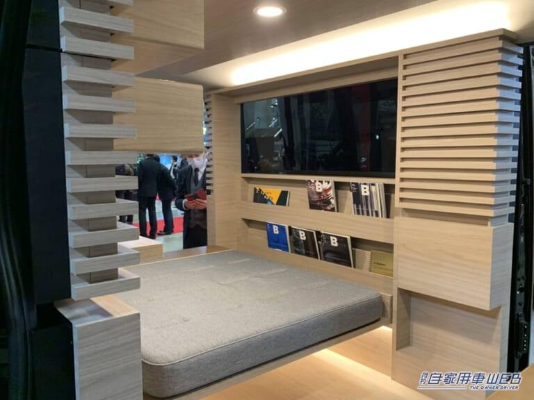 「クルマの内装感」を徹底的に消していることが特徴で、インテリアに木目加飾をふんだんに使うことでシンプルでミニマルなデザイナーズホテルのような洗練されたキャビン空間を実現している。さらにベッドとテーブルを組み合わせることで、リビングルームモードやベッドルームモード、ダイニングルームモードと、車内を自在にアレンジすることも可能。