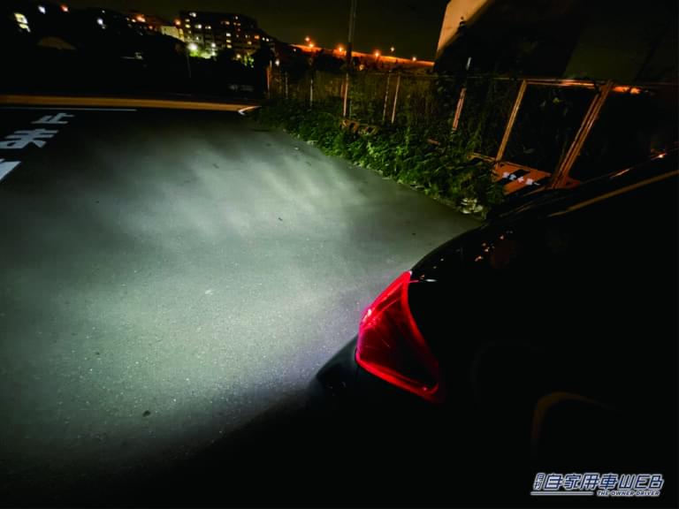 交換の効果は一目瞭然で、薄暗い電球色の光が眩しく純白の光へチェンジ。街灯がない場所でも驚くほど明るく照らし、車両後方の視界を確保してくれる。目視ではもちろんのことバックカメラの映像でも違いがよくわかる。障害物だけでなく横切るクルマや人の存在もいち早く認識でき、後退時の安心、安全を大幅に高められる。