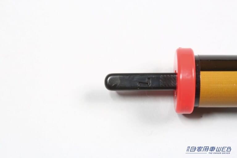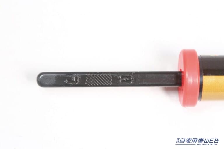使い方はバー型のタイヤエアゲージと一緒。まずは中央のバーを軽く押し込んでおく。引っ張り出せば目盛りの状態を見ることも可能。作業時には手袋やゴーグルなどの安全装備を用意しておこう。