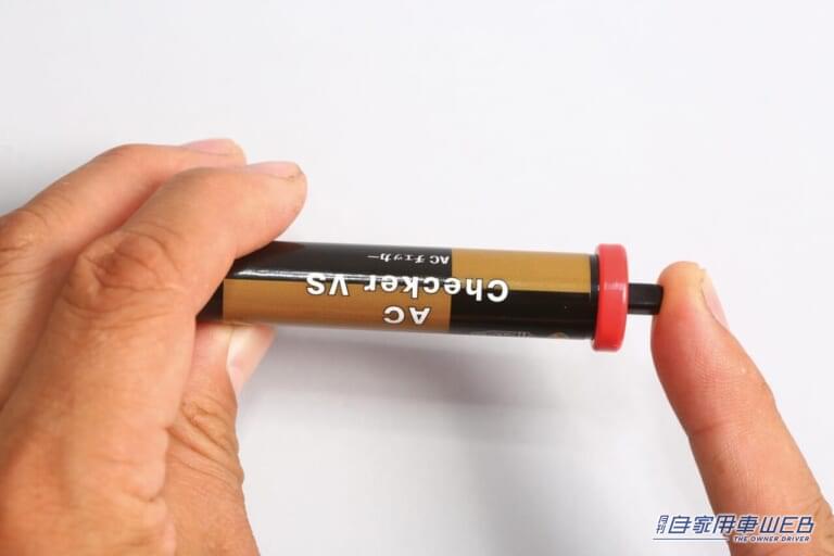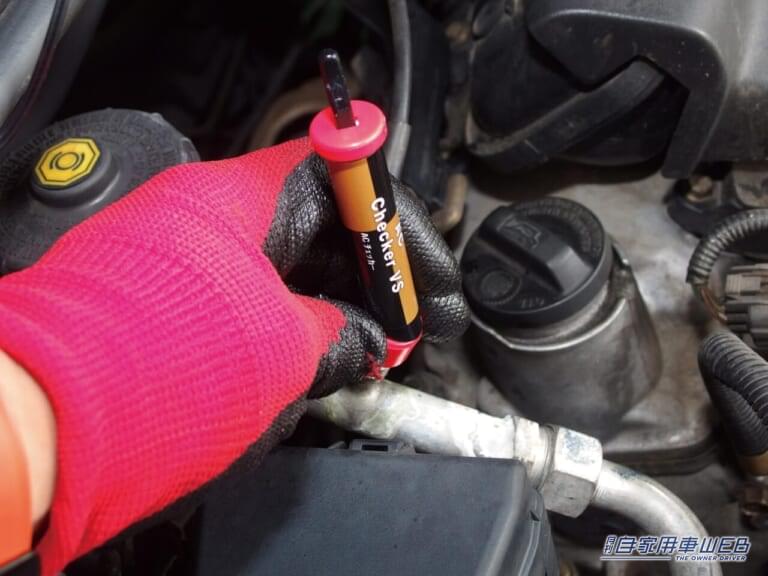 点検する際は外気温度は15〜35℃で行うのが望ましい。ブロワーの風量を最大にして30秒放置したタイミングでエンジンを止めて、低圧ポートに1〜2秒ほどACチェッカーを押し当ててゲージを読み取る。次にエンジンを掛け、エアコンをオンして設定温度20℃以下で約3分間計測して、その際の温度を読み取る。