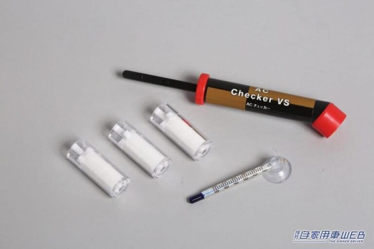 今回試してみた診断キットは、低圧側の冷媒圧力を測るACチェッカー(ガス検知器)と、内部を循環しているオイルの色をサンプリングするため3個のオイルチェッカー、吹き出し口の温度を測る温度計がセットになっている。
