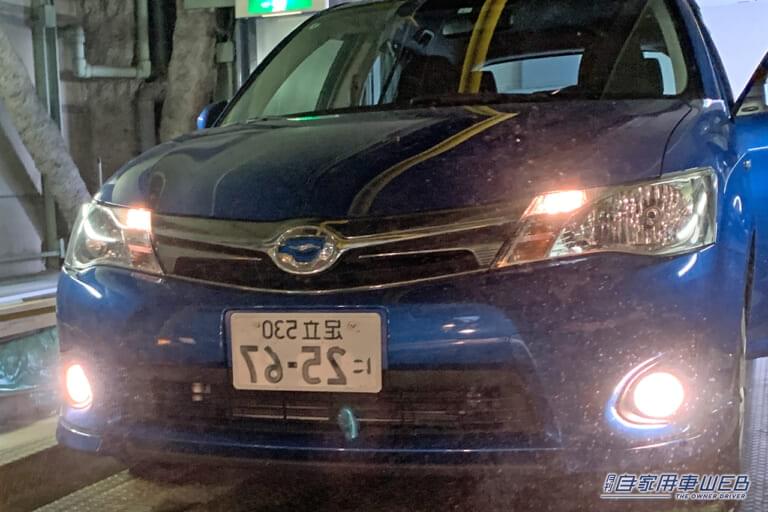 くだんのスイッチをONにした状態で車外にに出て、車両の前に回り込んでみると…。あ、ヘッドライト以外にも点灯しているライトがある! そう、この機能は、フォグランプ(フォグライト)と呼ばれるもので、悪天候時の視界の確保や自車位置を周囲に知らせるためのものとなる。※点灯は駐車場内で行っています