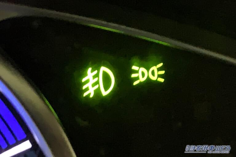 右のマークはライト(ロービーム)点灯の表示だが…。