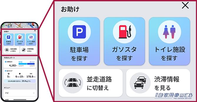 月額350 円(税込)の基本プランは「Apple CarPlay」「Android AutoTM」に対応しており、ディスプレイオーディオと連携できるほか、配送・送迎用途に便利な「住宅地図オプションプラン」(月額1,050 円/税込)を追加することも可能となっている。