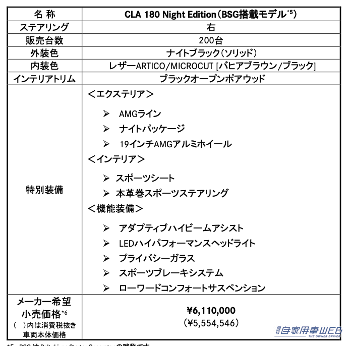 メルセデス・ベンツ日本合同会社は、コンパクト4ドアクーペ「CLA」の特別仕様車「CLA 180 Night Edition(BSG搭載モデル)」を発表。10月11日までオンラインショールーム先行販売期間として、申し込みの受け付けを開始する。なお、10月11日以降に販売可能な車両がある場合は、オンラインショールームに加え全国のメルセデス・ベンツ正規販売店ネットワークを通じて予約注文を受け付ける。価格は611万円(全国限定200台)。