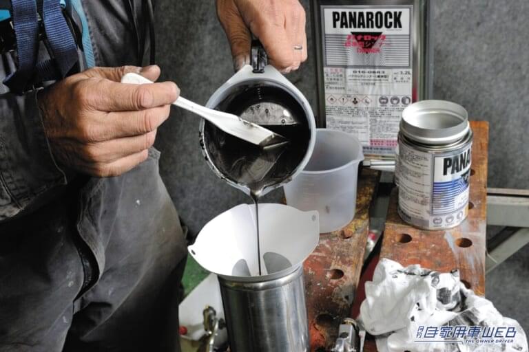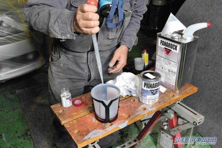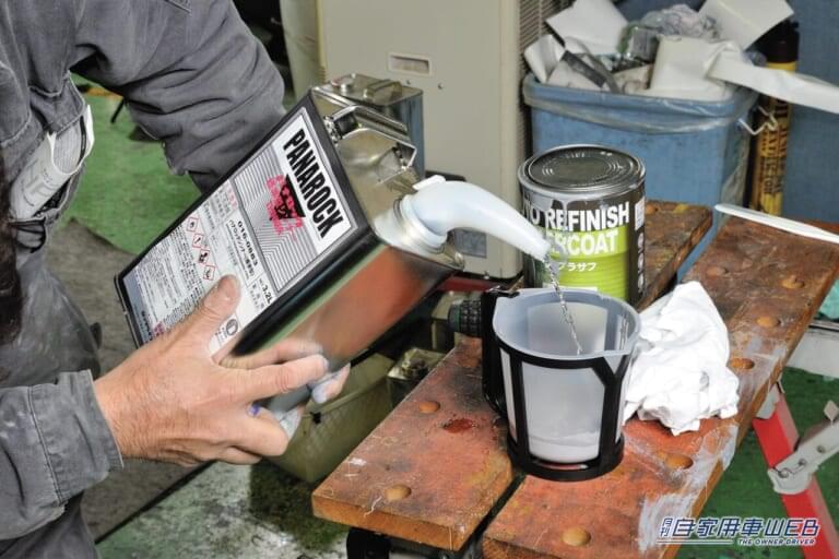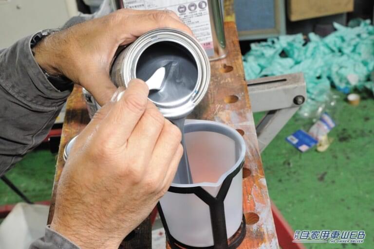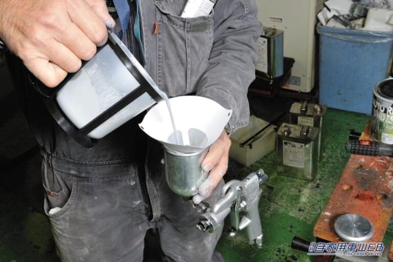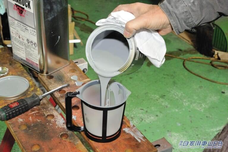 ストレーナーでろ過しながら、塗装カップに注入する。