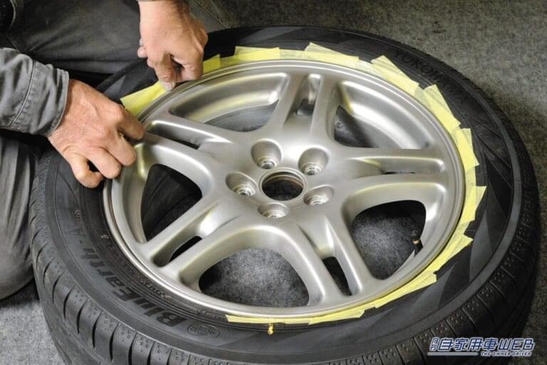 マスキングを取り除いても最低一晩はそのままの状態で放置して完全に乾かす。そして、完全に乾燥したところで作業前に外しておいたバランスウェイトを、タイヤ側面に記したマーキング位置に元通り打ち込む。これで完成だ。