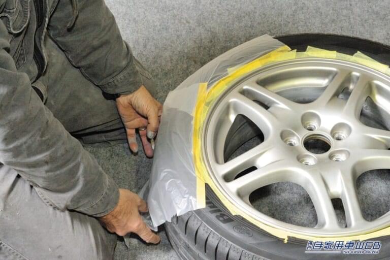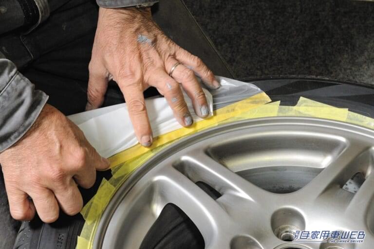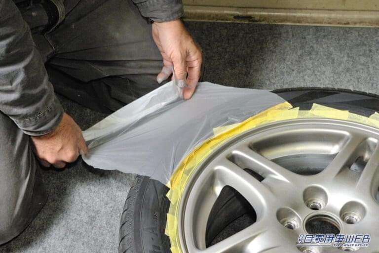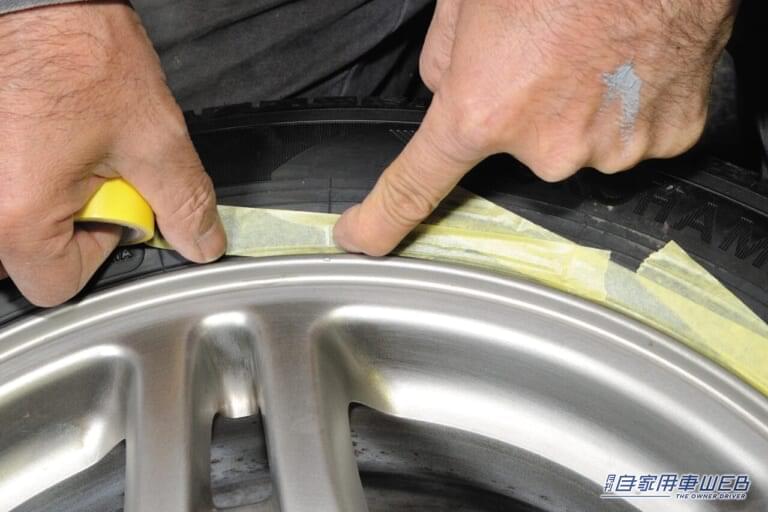 タイヤ全周をカバーしたら、作業中にバタつかないようマスキングテープを巻き付けるように貼ってしっかり固定する。