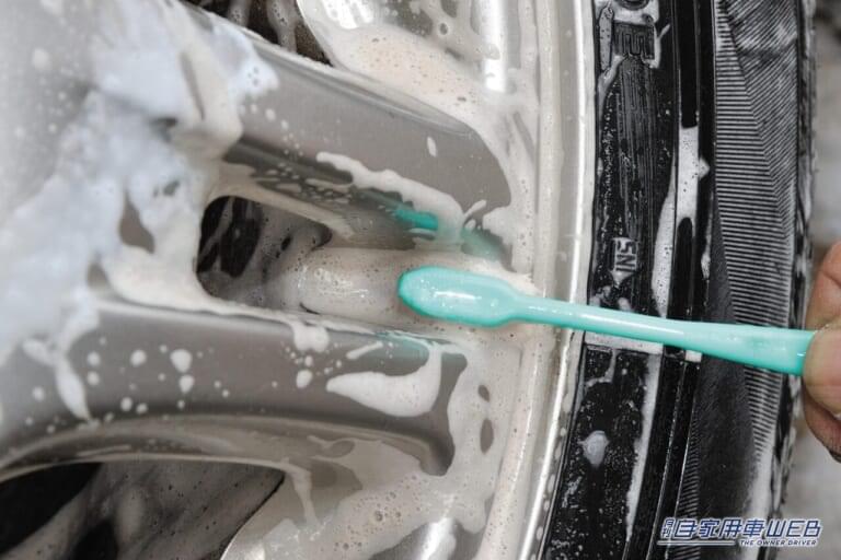 ホイールには路面から跳ねた油性の汚れが付着している。この油分は塗装の大敵! 隅々までキッチリ水洗いして油分を取り除く。