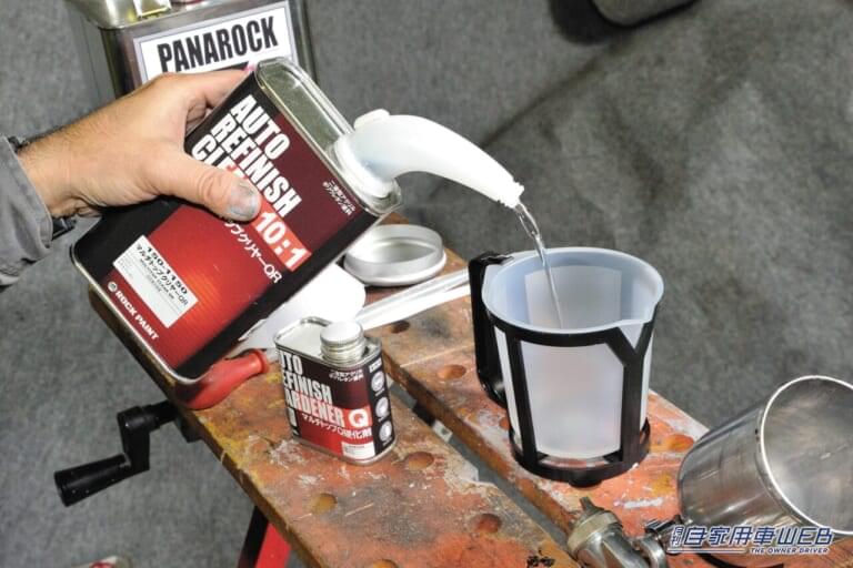 計量カップにウレタンクリアを取り出して重量比10%の硬化剤を混入。10 ~ 20%シンナーを注入して希釈し、ろ過しながら塗装カップに注入する。