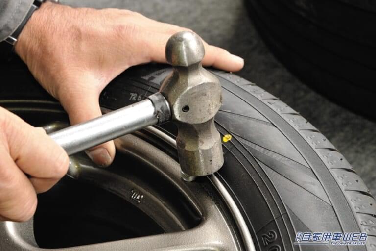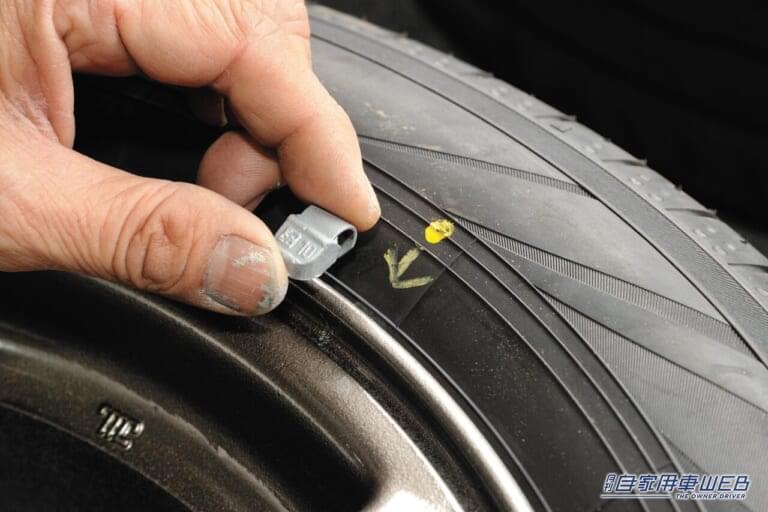 ちなみに、リム部にバランスウェイトが打ち込まれていると作業の邪魔になるので、作業開始前にタイヤ側面の打ち込み位置をマーキングして、ウェイトを外しておこう。