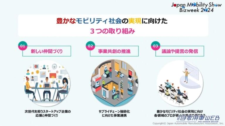 プロセスイヤーとなる今年、2024年は、ビジネスイベントとしてJAPAN MOBILITY SHOW BIZWEEK 2024を開催。ショーイヤーとなる2025年には、ショーケースであるJAPAN MOBILITY SHOW 2025を開催予定となる。