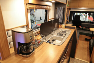 ベンチの下は空洞になっているので収納スペースとして活用できる。奥行きと高さも確保されているので日用品を収納するだけでなく、魅せる収納として活用したい。また、車内右側にはモダンなデザインのテーブルが設置されており、PC作業などのデスクワークにも対応。リラックスするだけでなく、ビジネスモードにも対応することができるのだ。