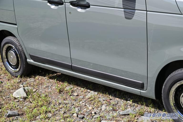 バンパーにはN-BOX の安定感のある四角いフォルムを損なわないように、コーナーをブラックで引き締めた専用バンパーを採用。スタンスのよさを強調すると同時に、ブラックのバンパーやドアロアーガーニッシュで統一感を意識している。