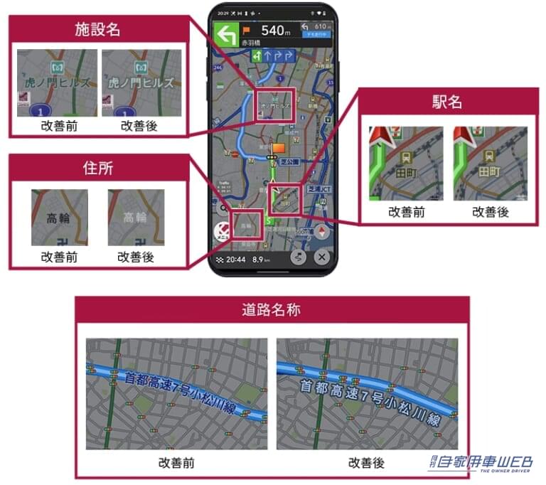 住所や施設、駅名称などの文字色を黒から白に変更したほか、道路名称の表示がルートや道路と重ならないようにするなど、夜モードでの地図表示の視認性を向上。