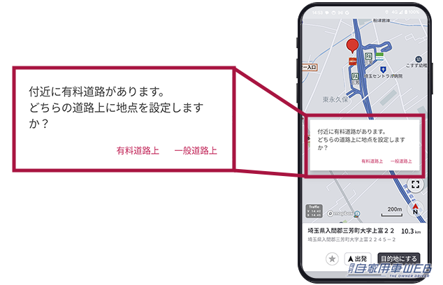 地図上の任意の場所を長押しして目的地/立寄地を設定する際に、有料道路と一般道路のどちらに地点設定するか選択になった。
