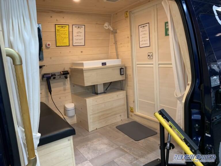 ハイエースのスーパーロング&ワイドボディハイルーフをベースにしているため全長5380mm、全幅1880mm、全高2285mmとかなり大柄だが、その分車内スペースにも余裕があり、脱衣所や浴室も十分に広い。