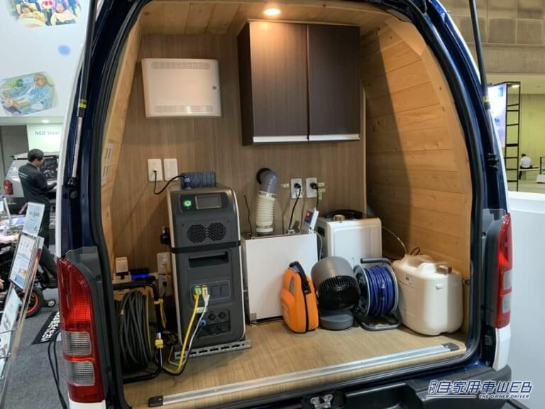 リヤゲートを開けるとバックヤードが現れる。ミストシャワー装置や20Lの水タンク、バッテリーや外部給電要コードなども備えている。