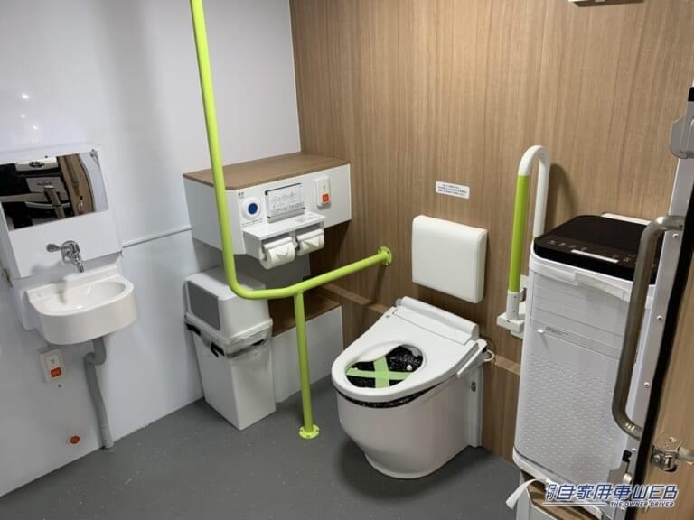 トイレは衛生的かつ節水型の真空式を採用しており、タンク容量は1日程度の運用は余裕の90Lだ。また、電源は電動車や発電機、家庭用コンセントにも接続可能なため運用の自由度が高いのも魅力。