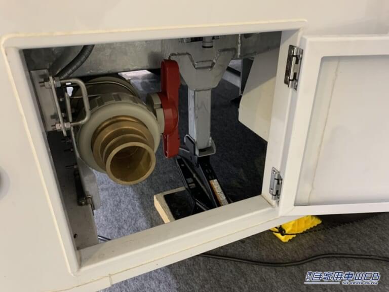 車体後部横には上下水道を接続するためのノズルを完備。電源も外部からの給電とすれば、使用回数の制限もなくなる。