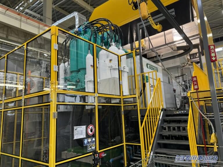 バッテリーケースの製造ラインに、6000 トンクラスのメガキャスト(高圧高精度鋳造マシン)を採用。従来 60 部品 を超える部品数を 5 部品に大きく削減したほか 、モデルサイズによって異なる専用部品と共通部品をFSW技術で接合することで 、 多様な部品を効率よく作り分けることができ、 生産効率向上と投資抑制を図っている。