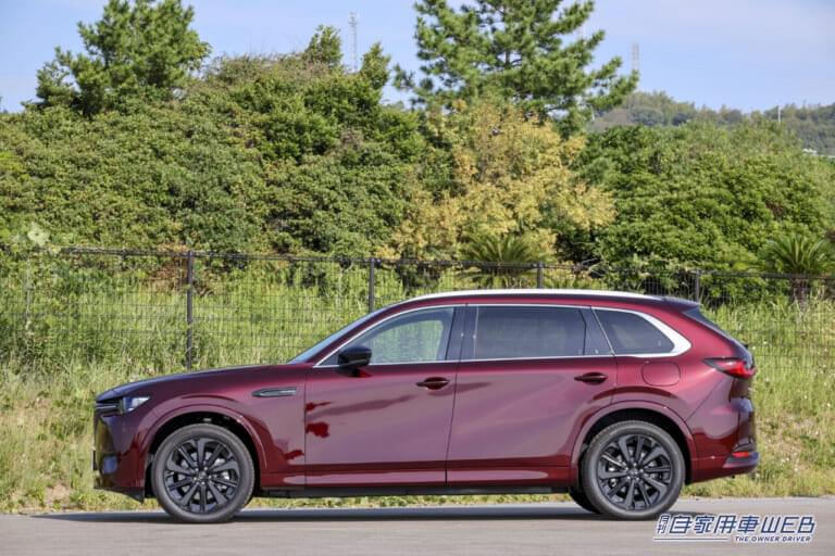 CX-80のポジションとしては、従来のCX-5とCX-8のの中間くらいの車格設定になっており、ミドルSUVとしての実用性やコスパの良さを魅力としているCX-5と比べると、内装加飾を含めたデザイン&質感や、FRレイアウトと最新パワートレーンを軸とする走りのプレミアム感を売りとしている。