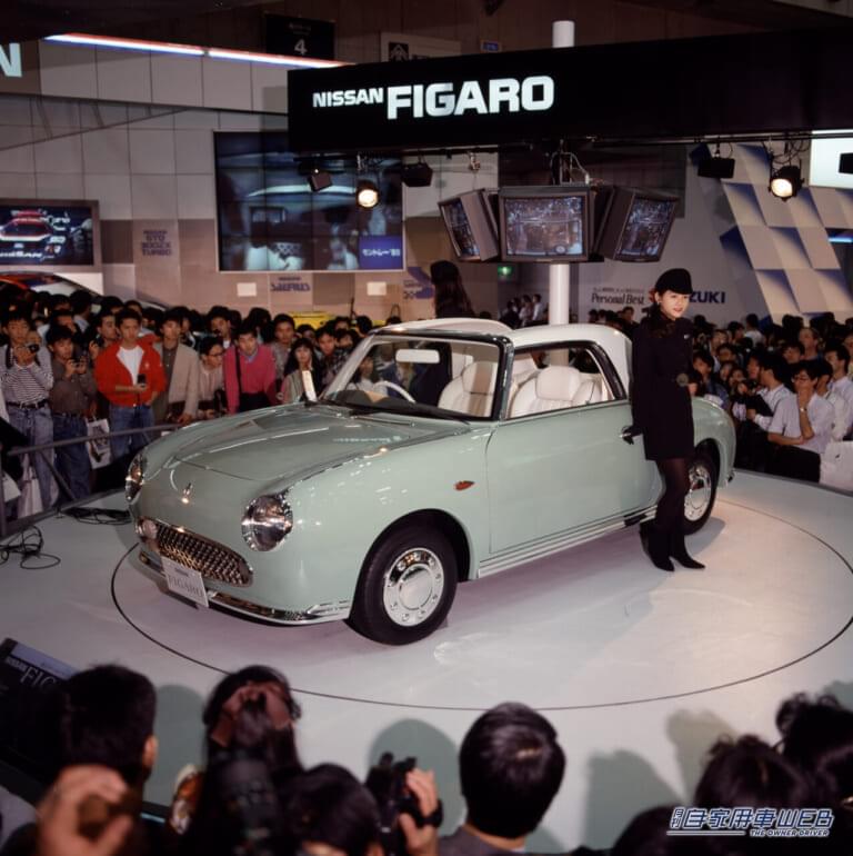 1989年の東京モーターショーに展示されていた「フィガロ」。発売されたのは1991年。フィガロは2万台の限定で、2回に分けて抽選を実施され、多くの愛好家のもとにデリバリーされている。