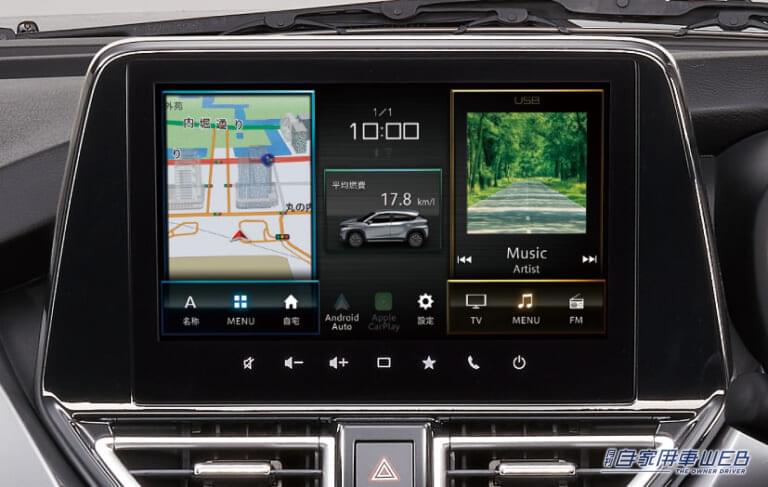また、「ナビゲーション」「車両情報」「オーディオ」が分かれたエリア表示で多彩な機能を簡単に操作でき、カスタマイズも可能なホーム画面を採用。さらに、ズキコネクトのサービスと連携することで、ナビ画面上への通知表示や、スズキトラブルサポートへの発信操作を行える。