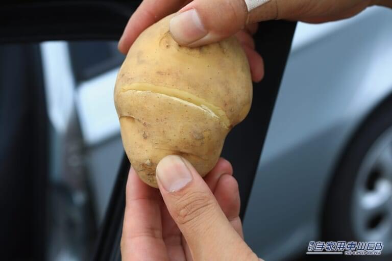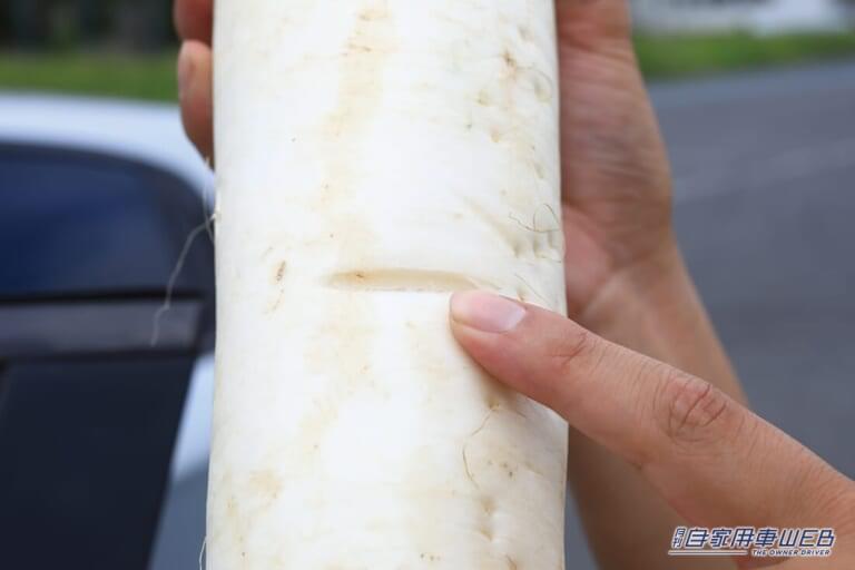 ギュっと窓は食い込むが、切断には至らず。写真の通り、半分くらい切れ目が入り、切れるか切れないかの分岐点な感じだ。ただ、ジャガイモですらここまでの切れ目を入れられると考えると、かなりのパワーだと想像できるだろう。次に大根をガシッと挟んでみたが、これはさすがにカット出来ず。窓の面圧が低いせいだろうか、ちょっと跡が付くくらいが限界だった。