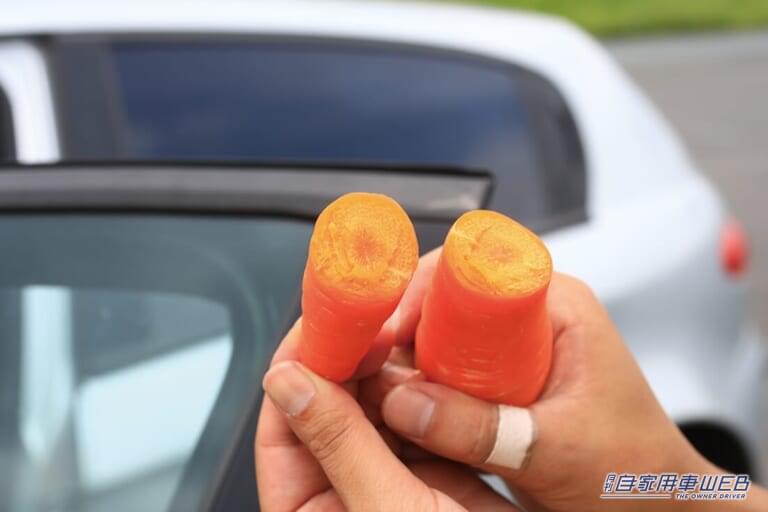 まず挟むのはニンジンとキュウリ。この2つは一般的な成人男性であれば手で折れるくらいの固さだ。さっそくセットして、パワーウィンドウを引き上げると…