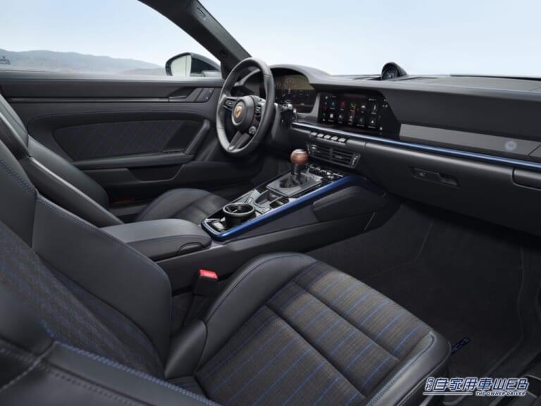 フルバケットシートを備えた新型911カレラTの最軽量仕様は、軽量ウインドウや断熱材の削減、6速マニュアルトランスミッションにより、車両重量は1478kgを実現。911カレラより40kg以上の軽量化を達成していることも特徴。